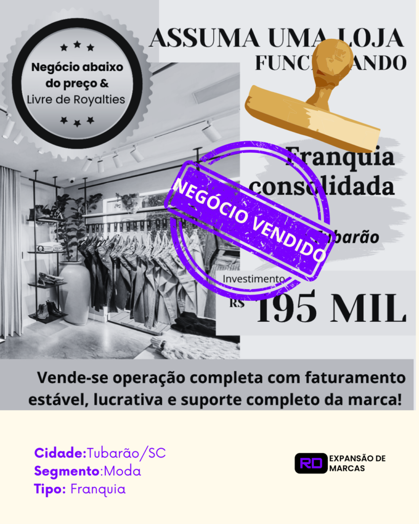 Ideal para quem busca um modelo de negócio testado, com margens sólidas e possibilidade de crescimento regional. Loja pronta para operar e com condições de contrato já negociadas com o shopping.