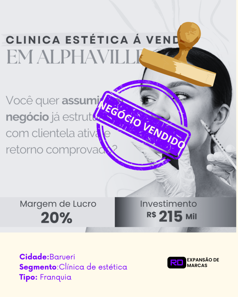 Clínica com mais de 10 anos de mercado e localização privilegiada em Alphaville Alvará sanitário vigente (poucas clínicas possuem) Equipamentos modernos, incluindo Heros 4D (ultrassom corporal e facial) Base ativa com mais de 9.000 clientes cadastrados Instagram com 35 mil seguidores e site próprio Equipe treinada, com biomédica para procedimentos injetáveis Margem de lucro de 20% com faturamento consistente Clínica já funcionando, pronta para continuidade da operação