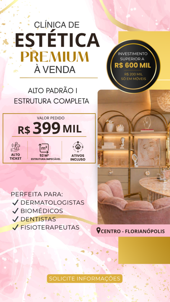 Oportunidade exclusiva de aquisição de clínica de estética avançada e harmonização facial, localizada em edifício empresarial de alto padrão no centro de Florianópolis.