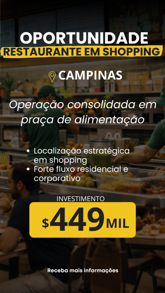 Excelente oportunidade de aquisição de franquia consolidada no segmento de alimentação saudável, localizada no Shopping Prado Boulevard – Campinas/SP, em ponto estratégico no centro da praça de alimentação.