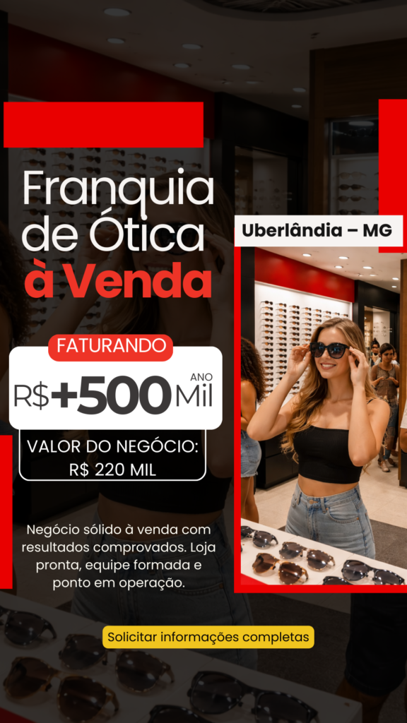 Operação franqueada de ótica e acessórios localizada em shopping de alto padrão em Uberlândia, em funcionamento contínuo há mais de 13 anos. A loja está situada em ponto estratégico, com alto fluxo de clientes e cercada por marcas consolidadas do varejo.