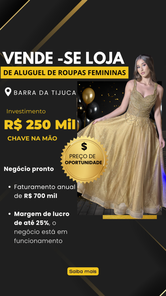 Venda de um negócio consolidado no segmento de locação e venda de vestidos de festas, com foco em debutantes, formandas, mães de noivos, madrinhas e eventos especiais. A operação funciona em espaço de 70 m² na cobertura de um edifício comercial bem localizado, com acesso fácil e visibilidade estratégica.