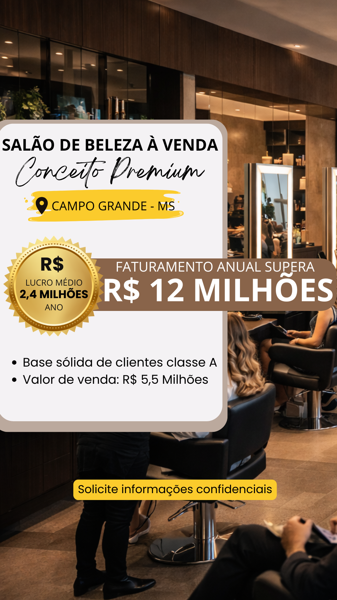 Valor de aquisição com retorno de investimento muito acima do mercado Maior salão de beleza do estado em estrutura e faturamento Marca registrada e consolidada Base sólida de clientes recorrentes de alto padrão Excelente reputação no mercado local Estrutura robusta com tecnologia de gestão Forte retenção de profissionais Alto potencial de expansão da marca